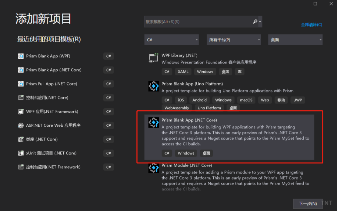 2、添加新项目并选择项目模板:Prism Blank App(.NET Core)。