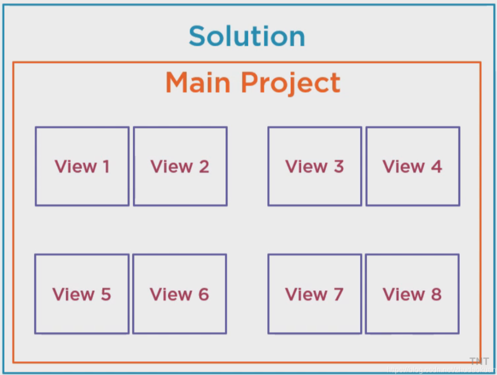所有的模块都在一个项目中,这使得应用程序当中,我们难以区分单独的模块,它们似乎变成了一个整体。所以,当我们开始考虑划分模块之间的关系的时候,并且采用新的模块化解决方案,它的结构将变成如下: